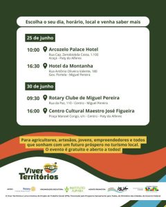 A programação que acontece nos dias 25 e 30 de junho e conta com rodas de conversa, oficinas participativas e apresentações culturais, valorizando saberes locais e incentivando práticas voltadas ao turismo regenerativo. O seminário é voltado para todos que desejam refletir sobre o futuro dos seus territórios, partilhar experiências e pensar soluções sustentáveis que respeitem a identidade, a memória e os recursos naturais da região.